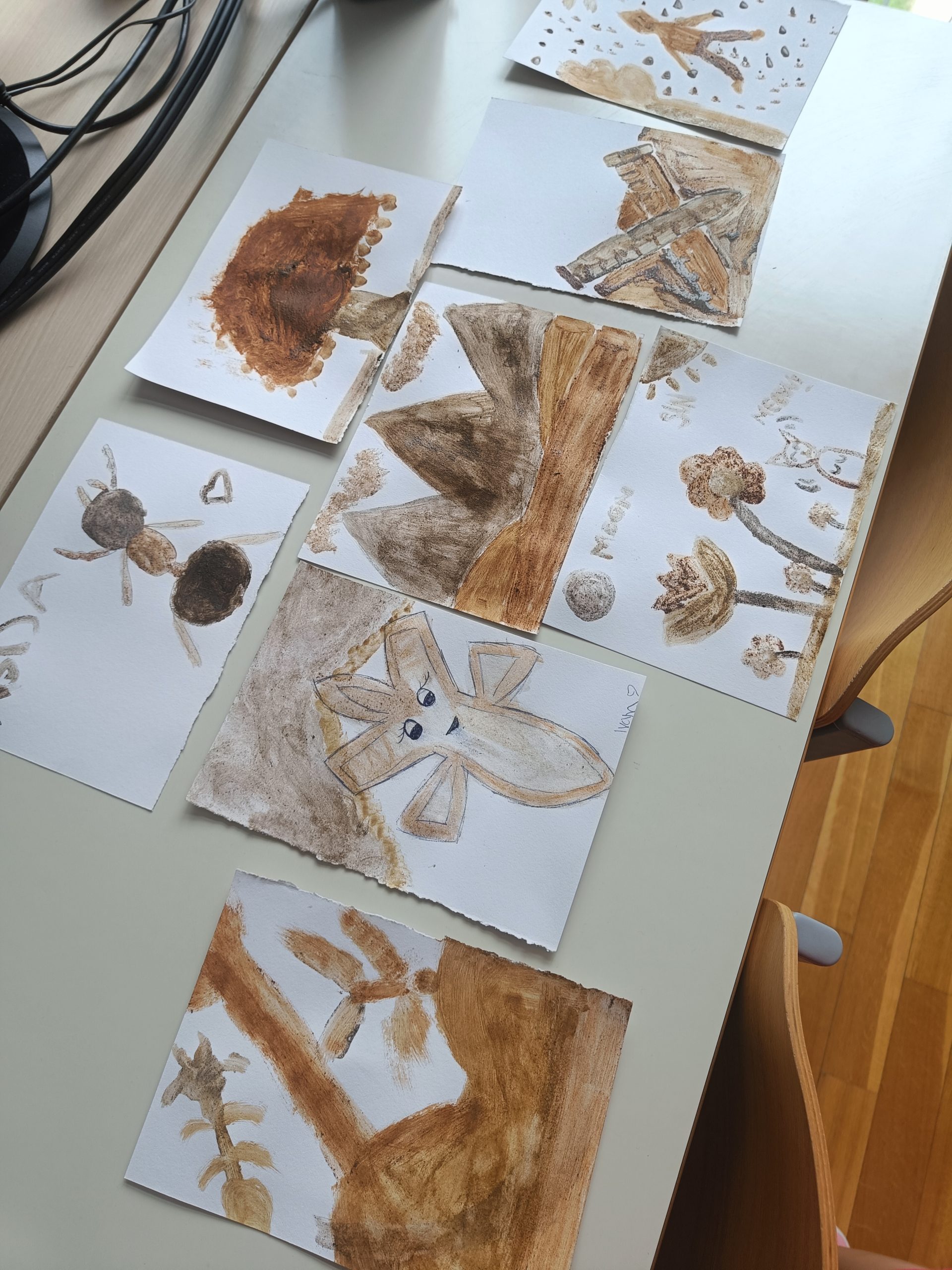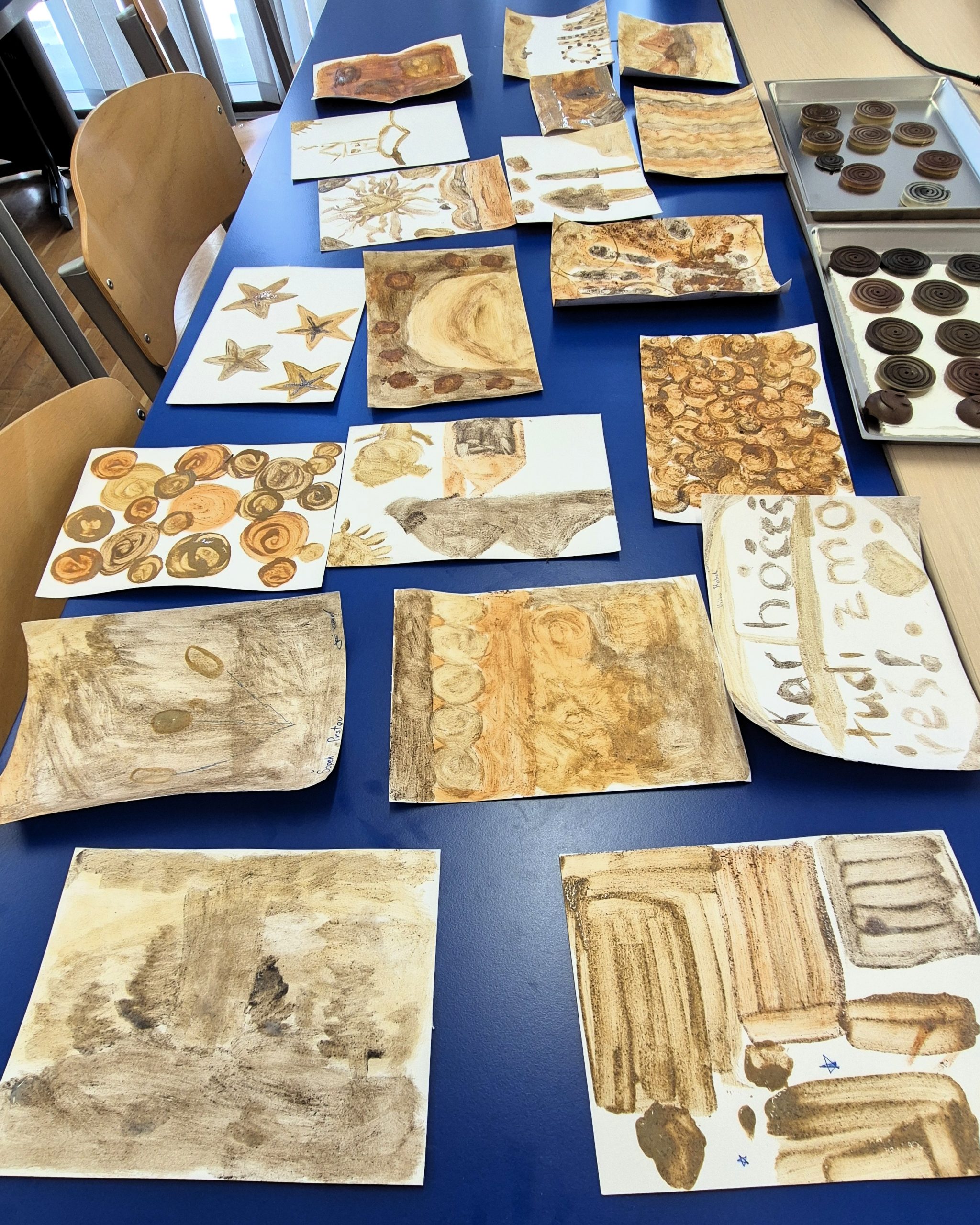 Za zaključek druženja smo tla spoznali še preko umetnosti. Tla so za poslikavo uporabljali že jamski ljudje, ki so po stenah jam in drugih bivališč uprizarjali pomembne dogodke in srečanja. Iz tal različnih barvnih odtenkov smo predhodno pridobili fino mlet in presejan prah, ki smo ga uporabili za pripravo barve za slikanje in pri izdelavi voščenk iz naravnih sestavin. Učenci so se prelevili v prave umetnike.